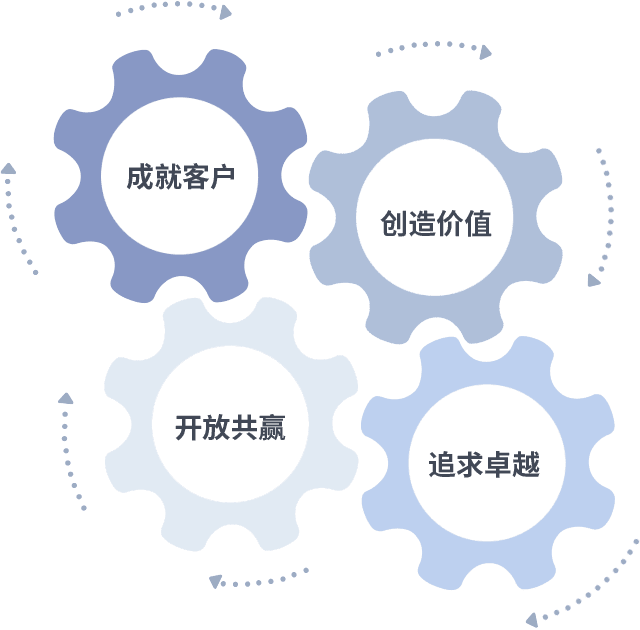 成就客户是一切决策的出发点,,,,创造价值是衡量所有工作的标准,,追求卓越是我们做事做人的态度,,,,开放共赢是我们的格局也是最终的结果。。。价值观的齿轮环环相扣,,,推动着组织里的每个人不断向前。。